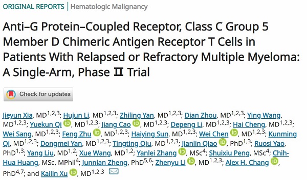 日前,接纳上海雅科生物科技无限公司研发胜利的GPRC5D CAR-T细胞医治手艺,由徐州医科大学血液病研讨所徐开林、李振宇传授团队停止II期临床实验,并获得国际抢先功效。