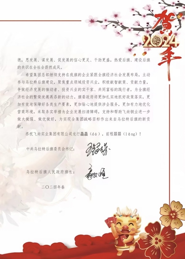 春节邻近,内蒙古乌拉特后旗党委、当局向飞尚团体发来贺信并致以节日祝愿。信中提到,团体成员企业飞尚铜业无限公司专一实业、克难前行、妥当运营,产量再立异高,2023年缔造产业总产值65.2亿元,上缴国度税收0.56亿元。